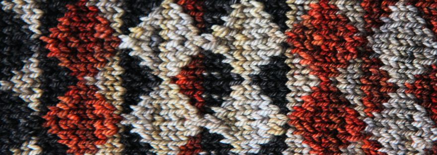 With hindsight, it may not have been necessary to catch the yarn on anything other than the 7-stitch floats. This would also have reduced the risk of the floating yarn from peeking through the pattern – if you look at the picture at the top of this post, you can spot a couple of places where the white yarn is peeking through the black pattern!
