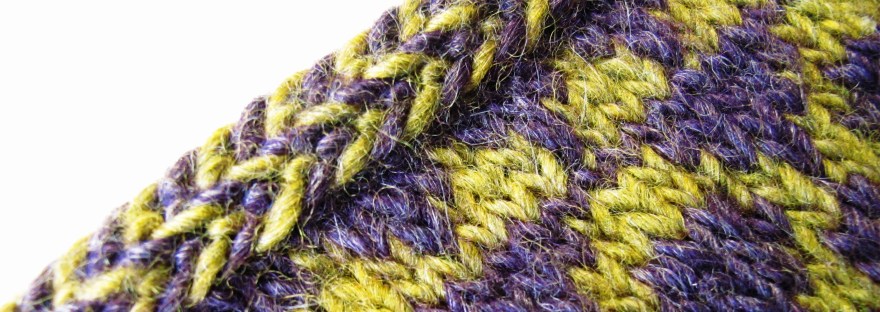 It is necessary to start with a set-up row or round where the two colours are alternated one stitch at a time. When using Latvian braid as an edging this set up row can be achieved using a two-colour cast-on method. A simple two-colour cast on, where one yarn is held on top and the other yarn held below (without twisting them), results in a line of ‘bumps’ of one colour next to a line of ‘bumps’ of the other colour. The photos below show what this looks like, with and without the braid. (There is more information on this type of cast-on in my post about double-knitting).