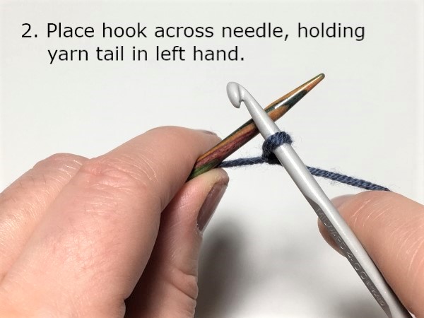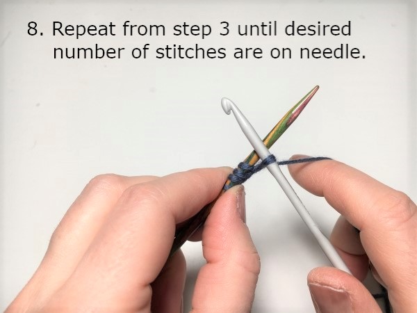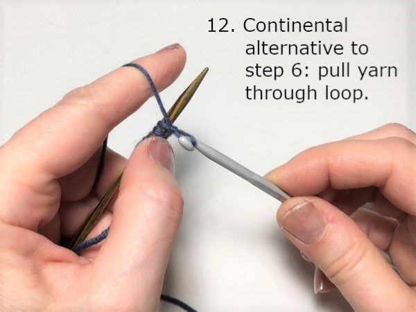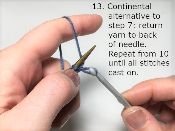 This is a step-by-step photo tutorial. Steps 1 to 9 cover the cast-on from start to finish but steps 3 to 7 are illustrated using working yarn held in the right hand. If you prefer the continental style, see alternative steps 10 to 13.