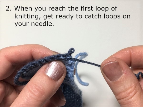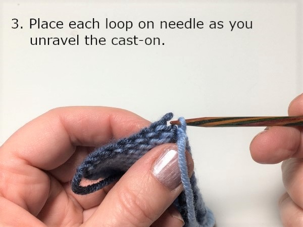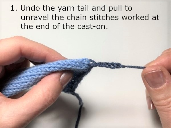 The steps below illustrate how to unravel the cast-on and place the stitches on a spare needle, ready to continue knitting or to graft the stitches to another set of live stitches, or to carry out a three-needle bind-off.