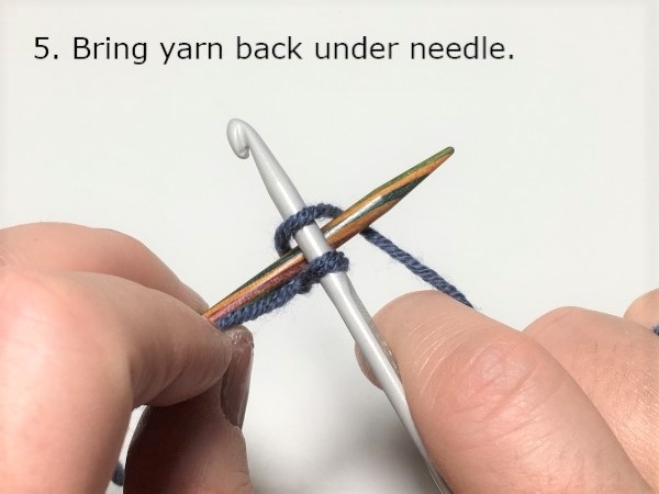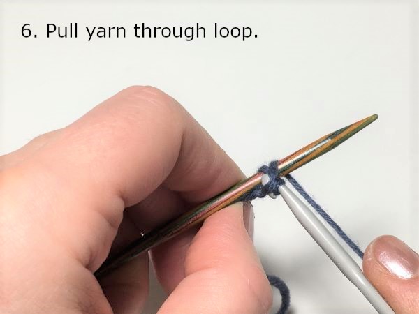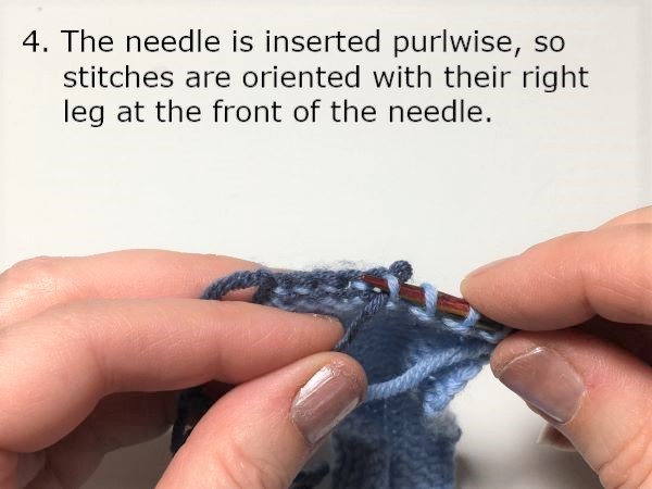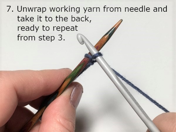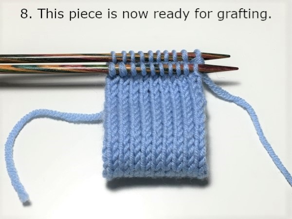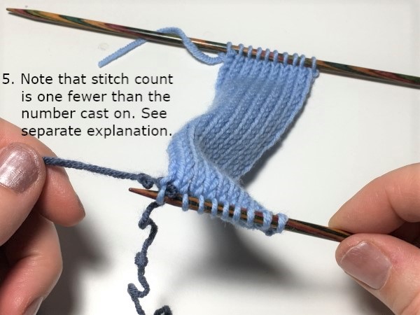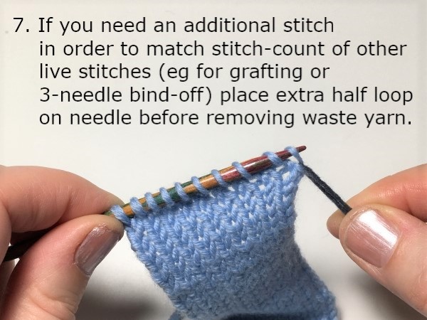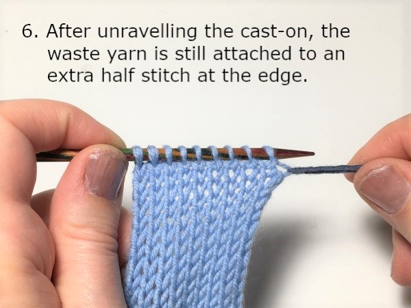 After picking up the loops of yarn, you may notice that there is one stitch fewer than the number of stitches originally cast-on. This is because the loops you are picking up sit in between the original cast on stitches and there is, in effect, an additional ‘half loop’ at each edge. (This is not the case if the provisional cast-on was for knitting in the round as there are no edges in that situtation). The extra half-loop at the edge of the cast-on is illustrated at step 6 below. If you require an additional stitch in order to match another set of live stitches for purposes of grafting, or a 3-needle bind-off, this loop can be picked up onto the needle, otherwise it can be dropped without any risk of unravelling.