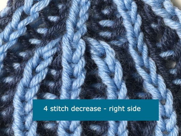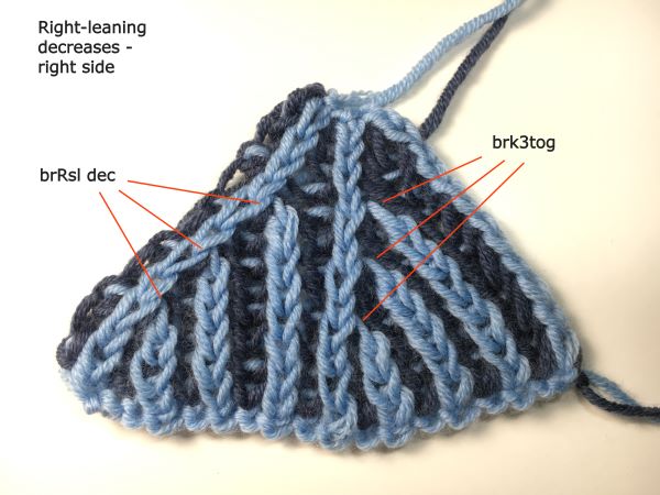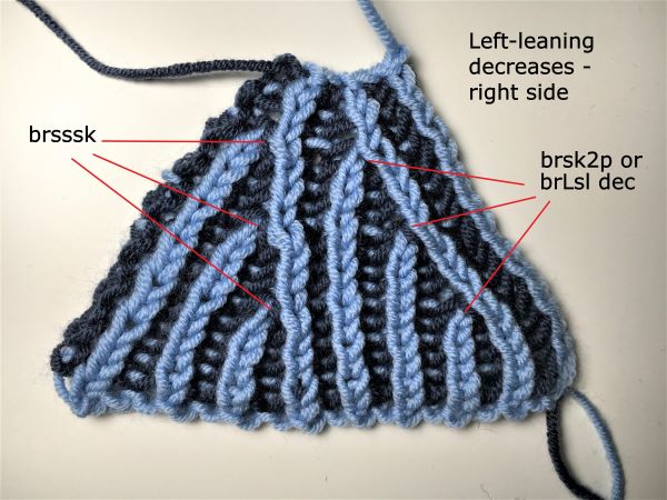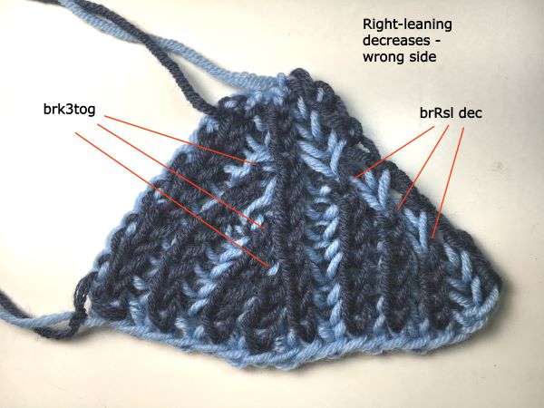 The general points made above for left-leaning decreases also apply to right-leaning decreases. There are two key methods of working a right leaning decrease over three stitches (two brk columns and the intervening purl stitch) on a single row.
