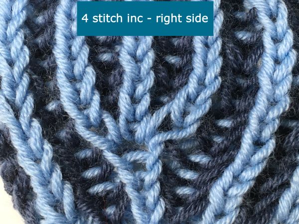 This increase is not reversible as shown in the photos above, however it can be worked on the wrong side of the work depending on the desired effect. In that case, the following row would be worked (on the right side of the work) as ‘sl1yo, k1, sl1yo’.
