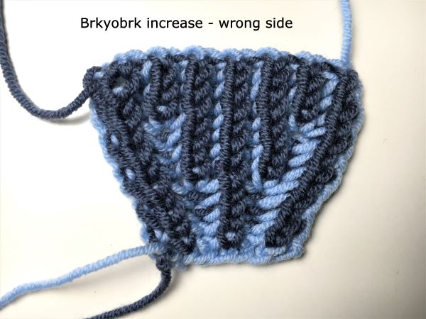 This increase produces 3 stitches out of one brk stitch so that the column of brk stitches on the right side of the work diverges into two columns of brk stitches. If working two-colour brioche, the increase is worked using the yarn colour which is dominant on the right side of the work.