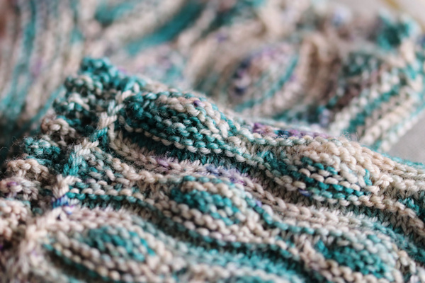 ‘Nafura’ is an Arabic word meaning ‘fountain’. Featuring short rows and lateral braids, knitted flat from side to side with a picot edging, the undulating contours of the stitch pattern in these mitts represents rippling water and perfectly shows off the subtle colour changes of the hand-dyed yarn of the same name.