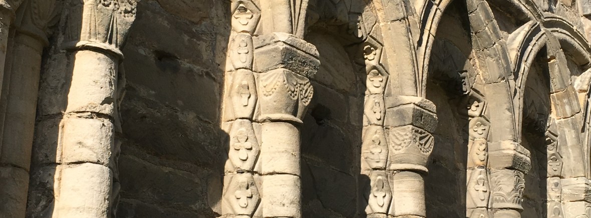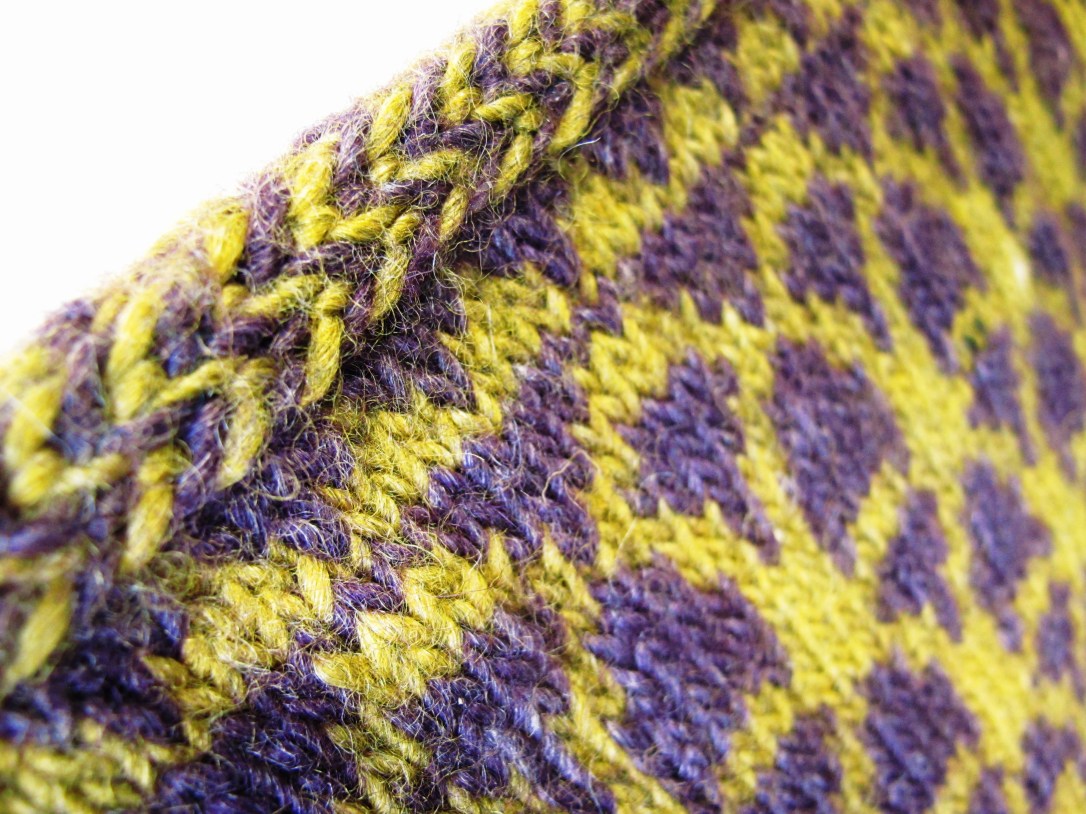 A colourwork hat and fingerless mitts inspired by a tiled pavement at Byland Abbey.