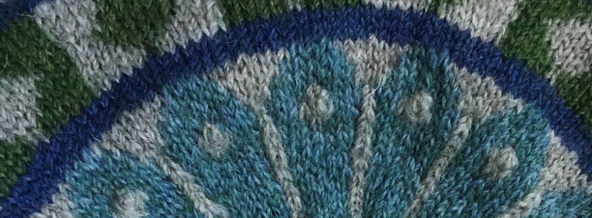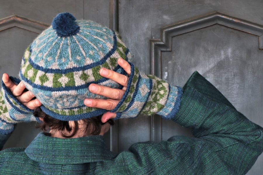 These mitts and hat are inspired by the ruins of Byland Abbey in North Yorkshire, famous for its 13th Century tilework pavements featuring intricate geometric motifs. They are knitted in the round using stranded colourwork technique, with small bobbles for texture, whilst the mitts are finished with a picot edge.