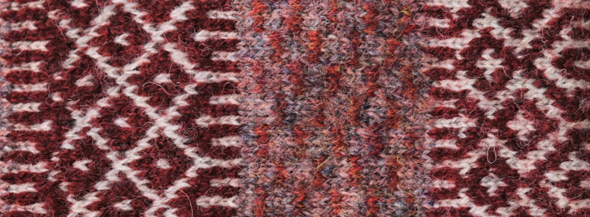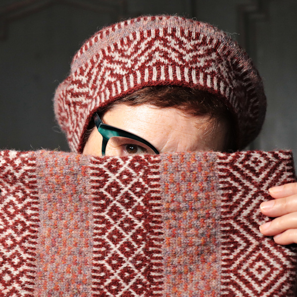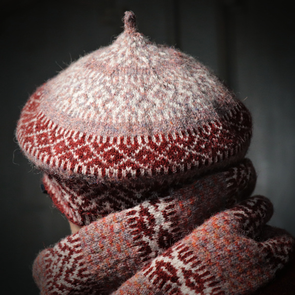 Featuring stranded colourwork knitted in the round, and grafted to form a continuous loop, the geometric patterns in this warm and cosy cowl are inspired by the striking patterns of traditional tilework in Khiva, Uzbekistan. The matching hat also features corrugated ribbing. They are made using Jamiesons of Shetland Spindrift, which comes in a huge array of colours, so a myriad of colour combinations would be possible!