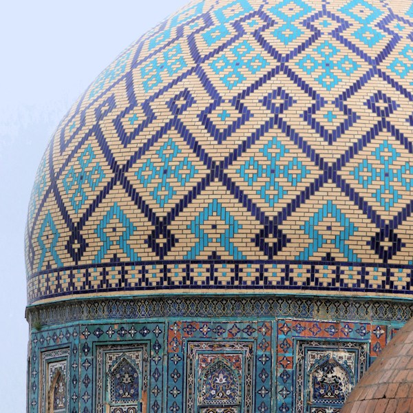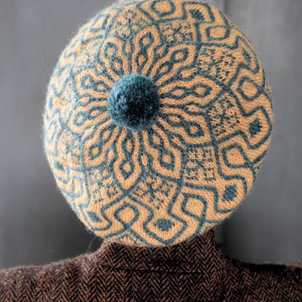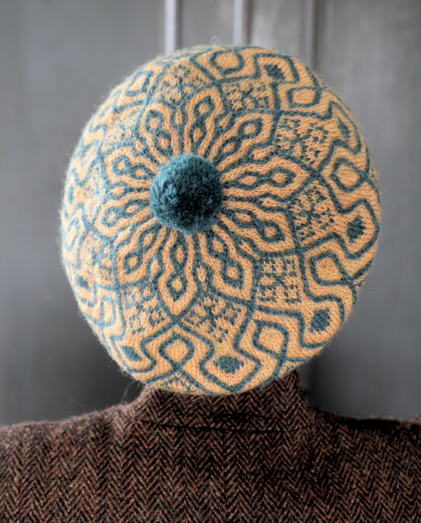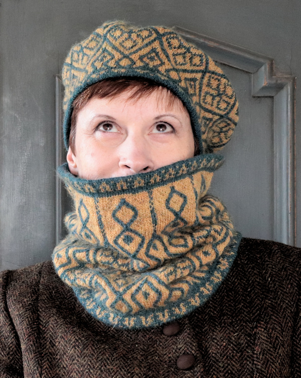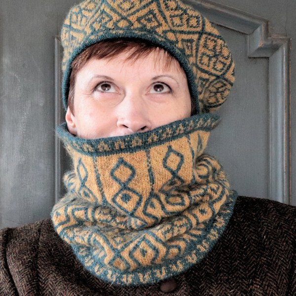 Inspired by the tilework on a beautiful dome in Samarkand, this hat and cowl use stranded colourwork and two-colour cables (which can be worked without the need for a cable needle – as explained in the pattern) to weave an intricate design.