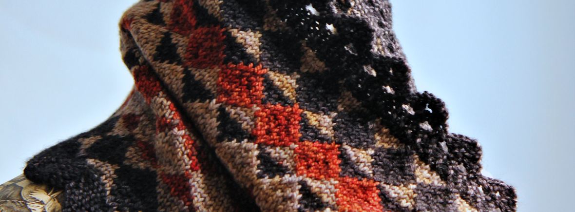 Featuring stranded colourwork knitted in the round, with a chevron lower edging and a knitted on lace top edging, this cowl is inspired by a mosaic pavement in Torcello, Venice. The hand dyed yarns by Madelinetosh and The Yarn Collective imitate the mottled colours of the ancient marble.